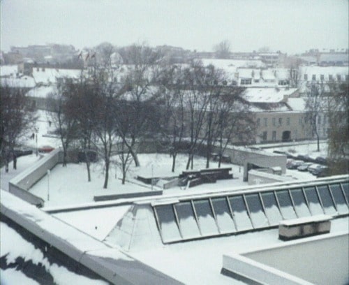 It is cold the evening we gather to discuss the selected readings entitled To have memories of architecture. We sit outside the gallery space huddled on woollen blankets. The first to speak is the film Scena by Deimantas Narkevičius. The film was screened from a projector poised resourcefully on a stack of cardboard boxes inside the space. The scale of the projection is no larger than an A5 – reminiscent of a postal envelope and rear-projected onto the gallery window. The film presents a series of interviews with people who work inside the CAC, Contemporary Art Center in Vilnius. The Lithuanian voices comment on the very physical and bodily affects architecture can produce; particularly in public spaces built during modern communism’s aspiration for permanence and social function.